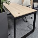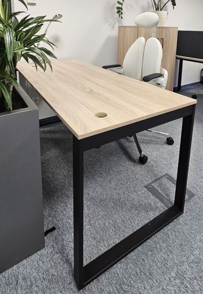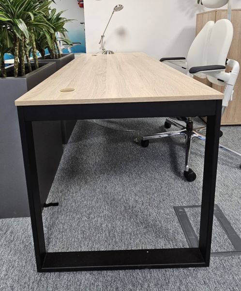 Biurko gabinetowe z blatem w kolorze bielonego drewna o wym.160x70 cm wsparte na metalowej czarnej konstrukcji, z nogą w kształcie litery O, w industrialnej stylizacji.