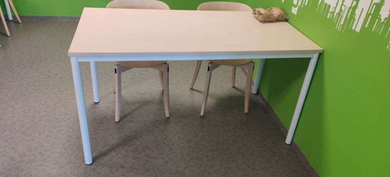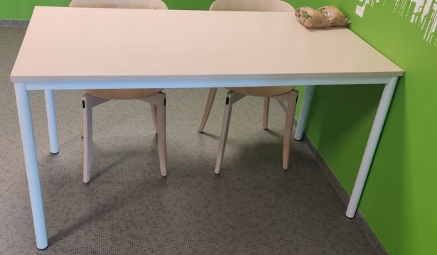 Prosty stół do kantyny o wymiarach 140x70 na nodze typu I z blatem w kolorze brzozowym.