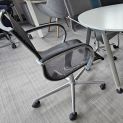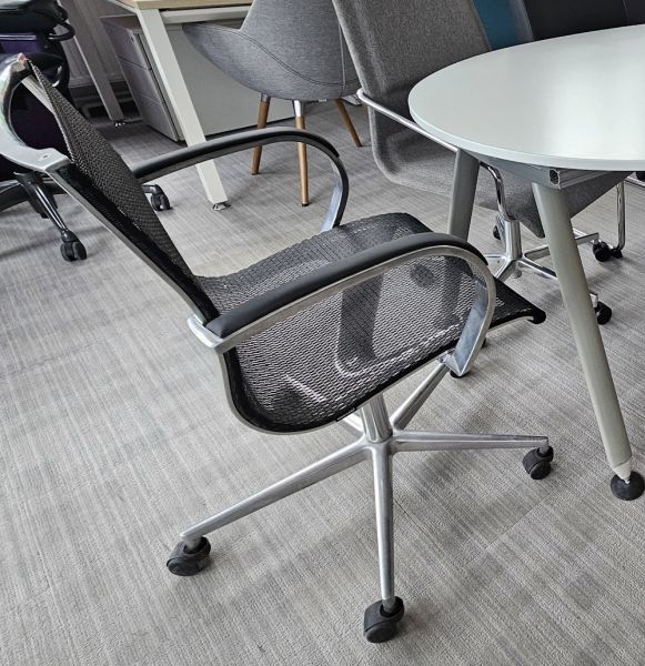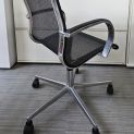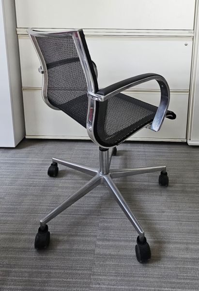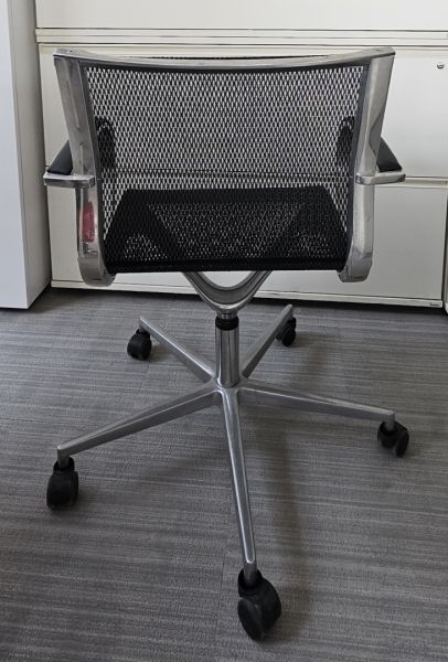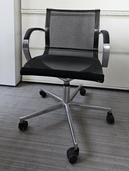 Na metalowej bazie,z siedziskiem i oparciem z czarnej siatki z czarną lamówką, elementy metalowe chrom. Podłokietniki po renowacji.