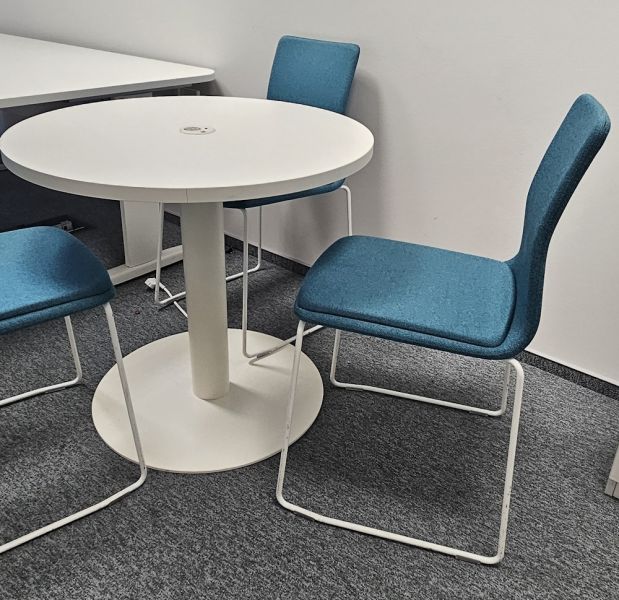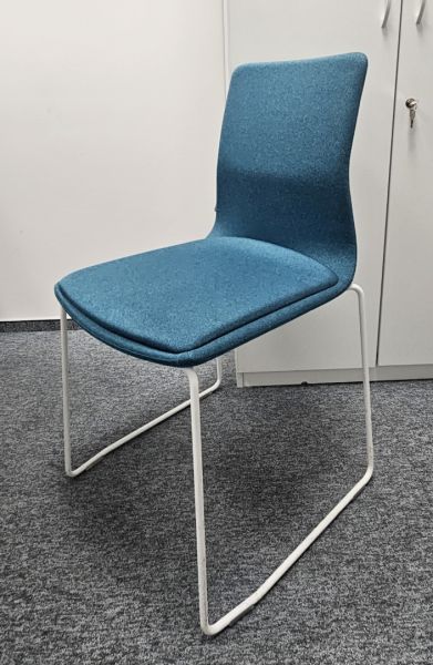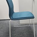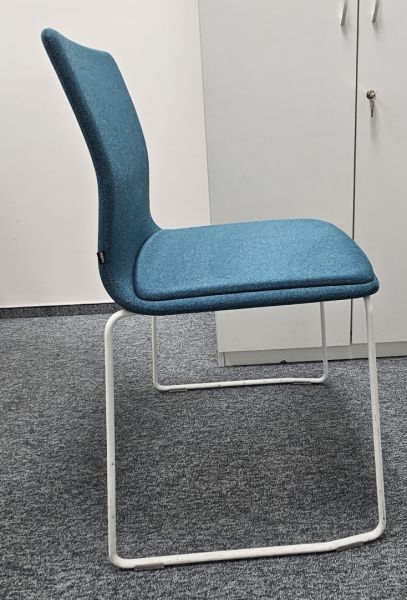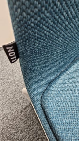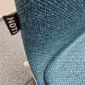 Siedzisko i oparcie tapicerowane na kolor niebieski/turkusowy z bardzo ciekawą fakturą tapicerki. Baza metalowa malowana na kolor biały.