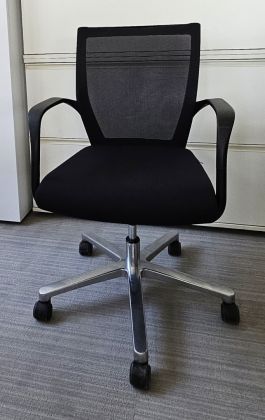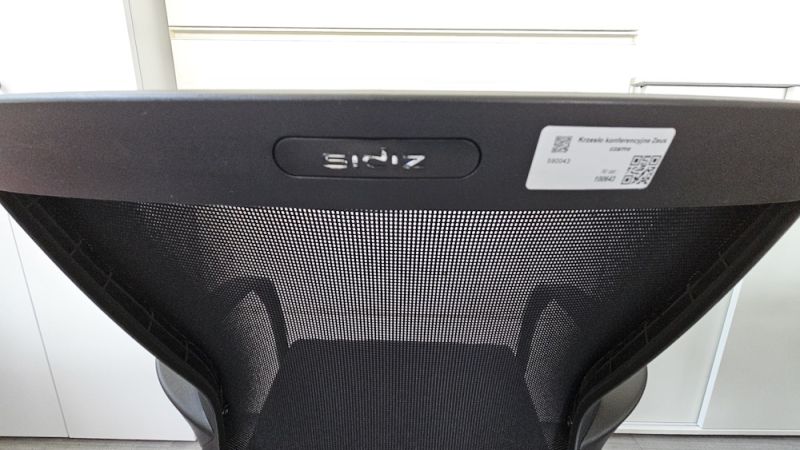 Krzesło konferencyjne na metalowej bazie,na kółkach, z czarnym siedziskiem i oparciem z czarnej siatki z czarną lamówką, elementy metalowe chrom. Podłokietniki.