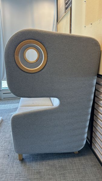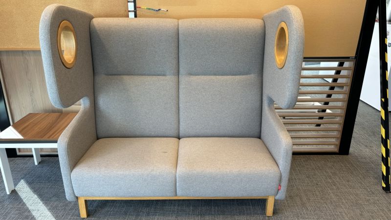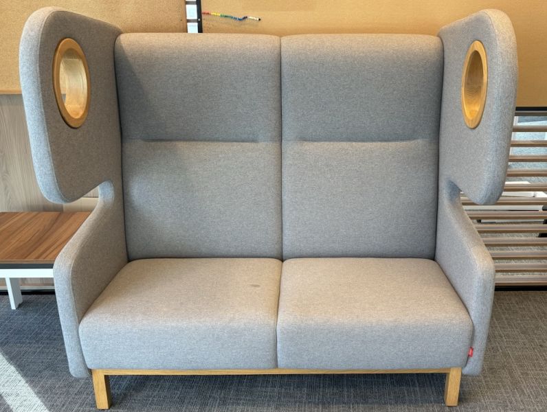 Oryginalna kolekcja sof i foteli Packman wprowadza pozytywną energię do biura. Stanowi awangardowy, funkcjonalny dodatek nadający niepowtarzalny charakter przestrzeni. Sofa 2 os. została wykonana z szarej tkaniny oraz posiada naturalne elementy drewniane. Wymiary: szer. 160 cm x gł. 90 cm i wys. 150 cm.