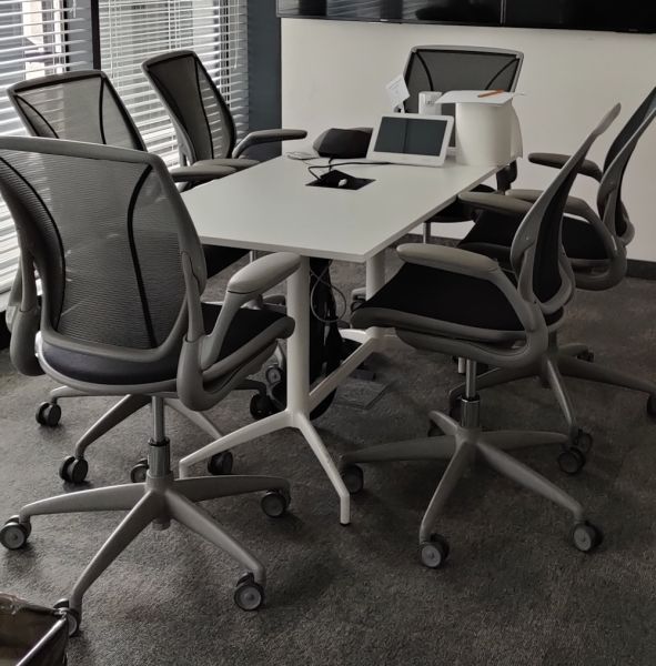 Stół konferencyjny o wymiarach 160x80 cm lub 140x70 cm, biały blat i biała konstrukcja. Stół modułowy, nieskładany. Niektóre produkty posiadają mediaport. Stan bardzo dobry.