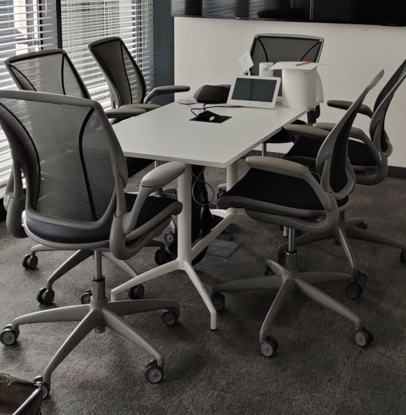 Stół konferencyjny o wymiarach 160x80 cm lub 140x70 cm, biały blat i biała konstrukcja. Stół modułowy, nieskładany. Niektóre produkty posiadają mediaport. Stan bardzo dobry.