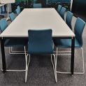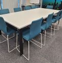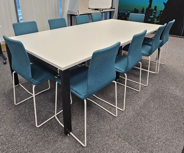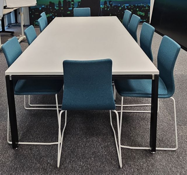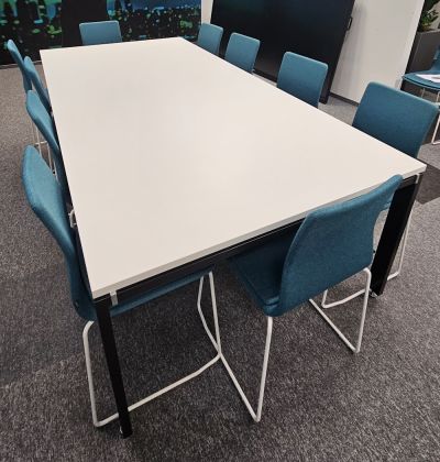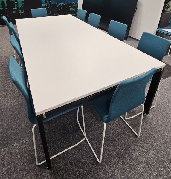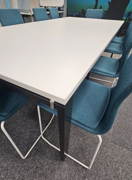 Stół konferencyjny to nowoczesny i uniwersalny mebel na czarnej, prostej nodze I oraz blacie o wymiarach ok. 240x120 w białym wykończeniu. Idealny dla 10 osób.
