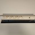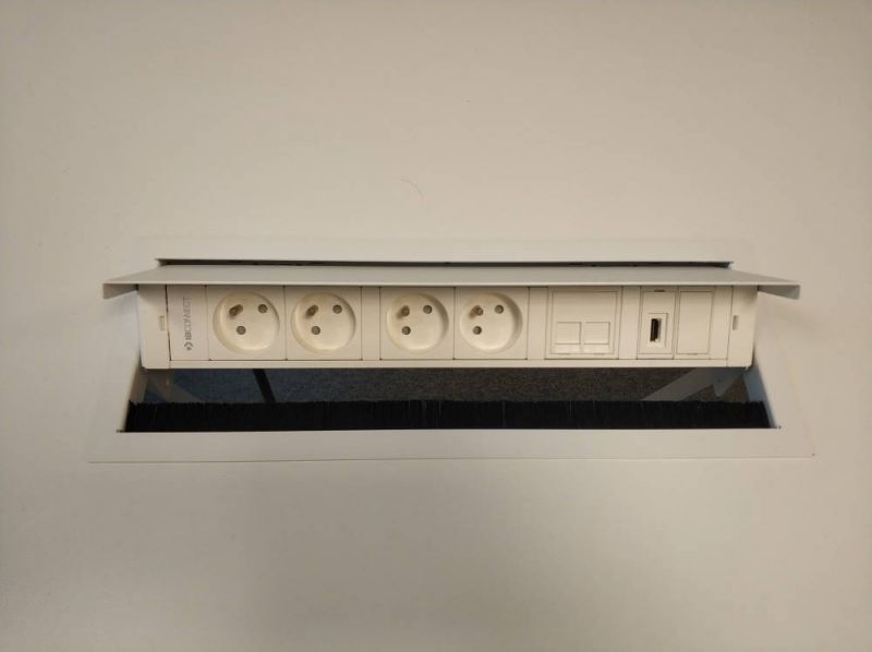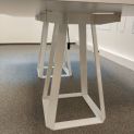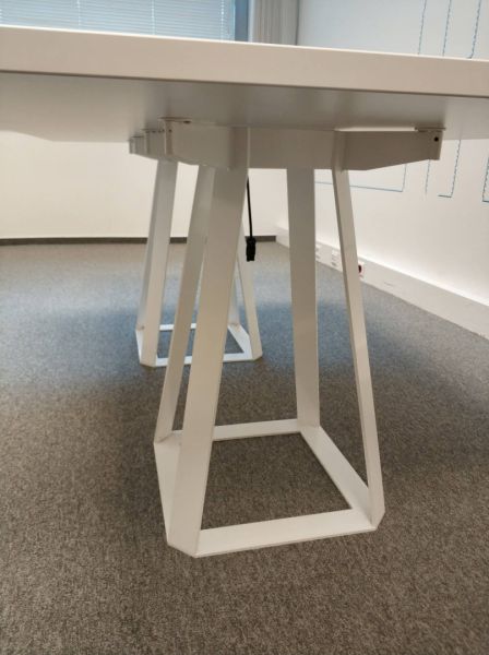 Biały blat wsparty na dwóch białych, oryginalnych nogach. Dzięki cofnięciu nóg użytkownicy uzyskują swobodę i dużą przestrzeń na nogi.