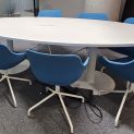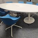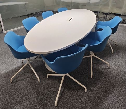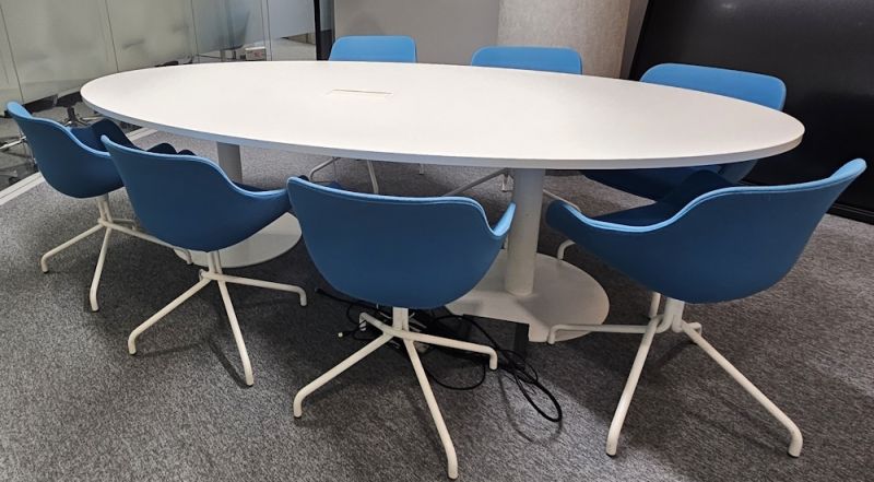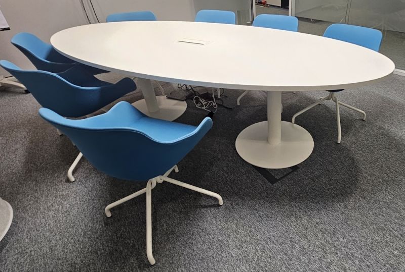 Stół konferencyjny w wymiarze 270x120 z blatem w wykończeniu w kolorze białym w kształcie elipsy. Nowoczesny i uniwersalny mebel idealny dla 10 osób. Nogi białe talerzowe.