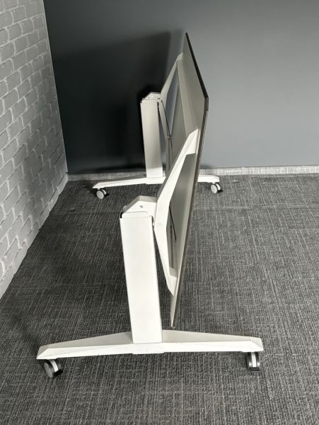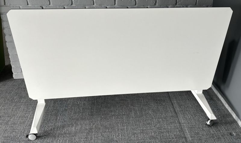 Stół konferencyjny w kolorze białym z czarną krawędzią, mobilny. Stół posiada składany blat i kółka co umożliwia przechowywanie. Na nogach mogą być widoczne ślady użytkowania (od butów, bądź rysy). Producent VANK.