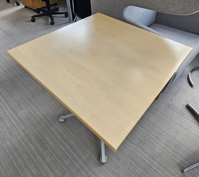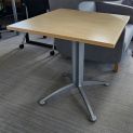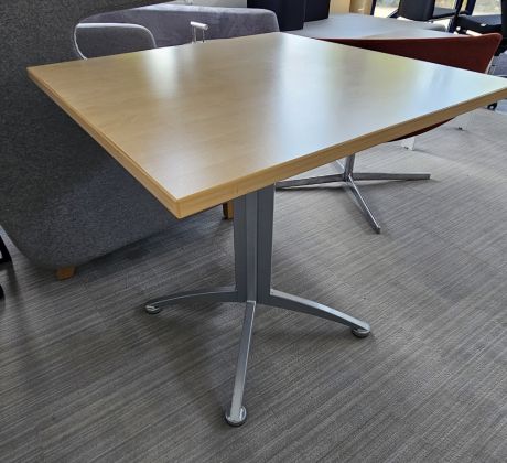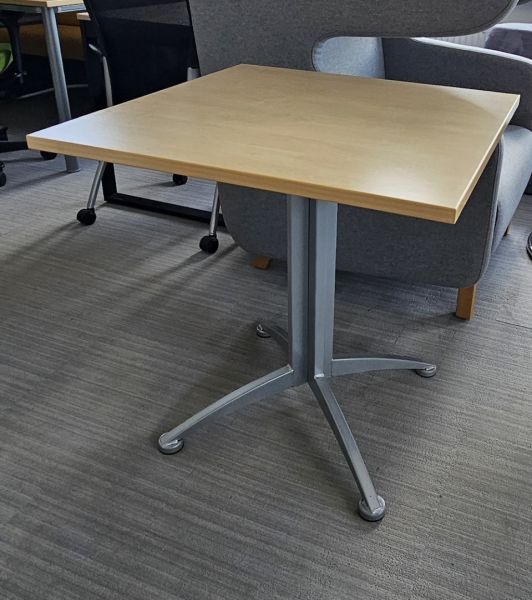 Blat w kolorze brzozy o wymiarach 70 cm x 70 cm. Noga szara, krzyżakowa.