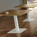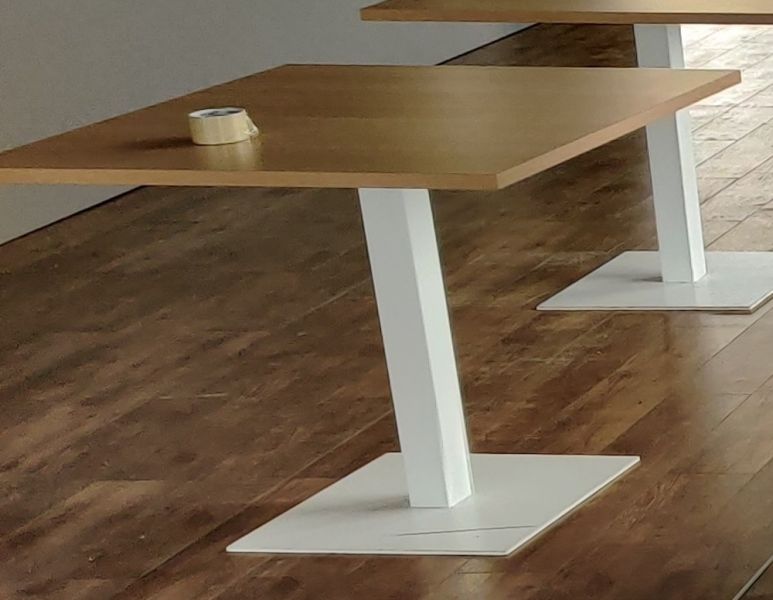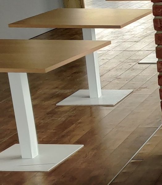 Blat w kolorze dębu. Baza stolika biała kwadratowa.