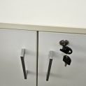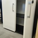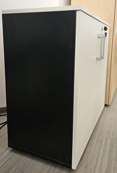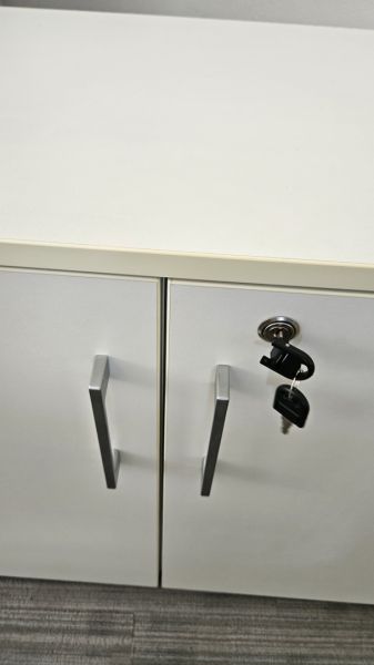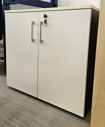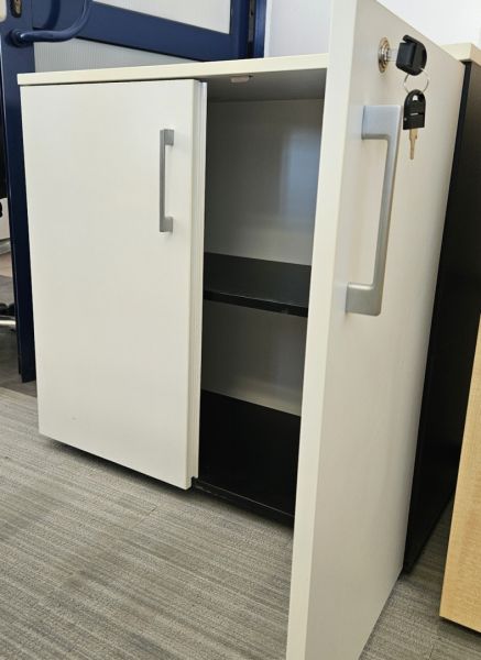 Szafa dostosowana do dokumentów w formacie A4, półki zapewniają miejsce dla segregatorów. Mogą nie posiadać kluczyka. Wymiary przybliżone: wys. ok. 76 cm, szer. 80 cm, gł. ok. 42 cm.