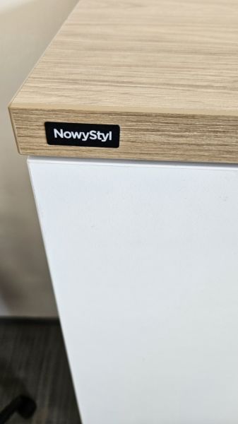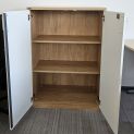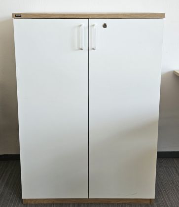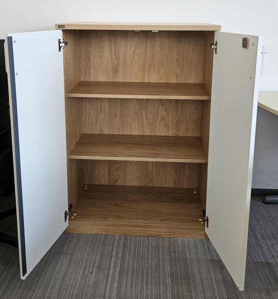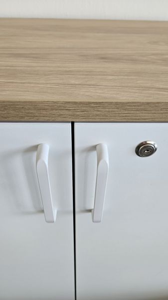 Szafy aktowe w wysokości 3OH. Wykończenie korpus, półki i plecy w kolorze orzech/dąb oraz fronty kolor biały.