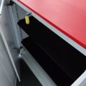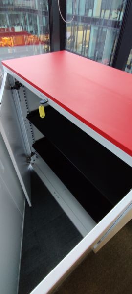 Wykończenie: korpus i fronty białe, półki czarne metalowe, top czerwony.