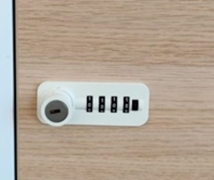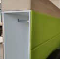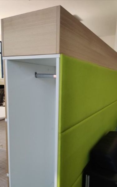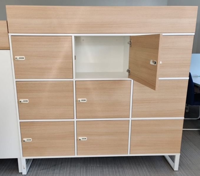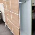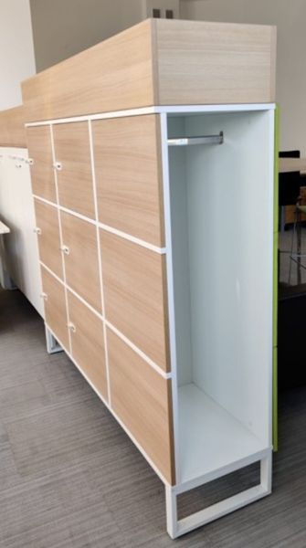 Szafa FURNIKO typu lockers z 6-cioma modułami zamykanymi na zamki szyfrowe z nadstawianą dużą donicą na kwiaty. Tył wykończony tapicerowanym panelem w kolorach szaro-zielono-niebieskim. Korpus biały, fronty dąb bielony. Mebel stanowi świetne rozwiązanie do biur, zarówno do przechowywania dokumentów, rzeczy prywatnych, jak i do estetycznego wydzielania przestrzeni (wysokość i szerokość ok. 160 cm). Dostępność ok. 20 szt. (8 P + 12 L) – drążek na ubrania z prawej lub lewej strony.